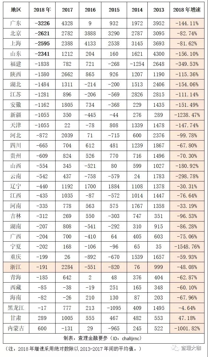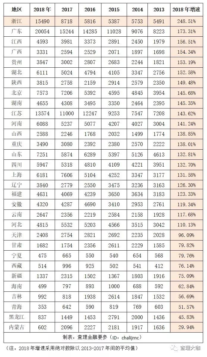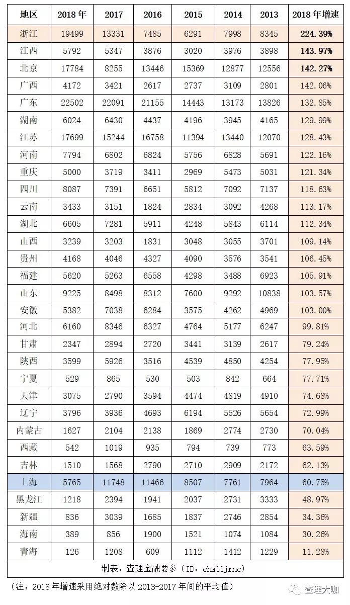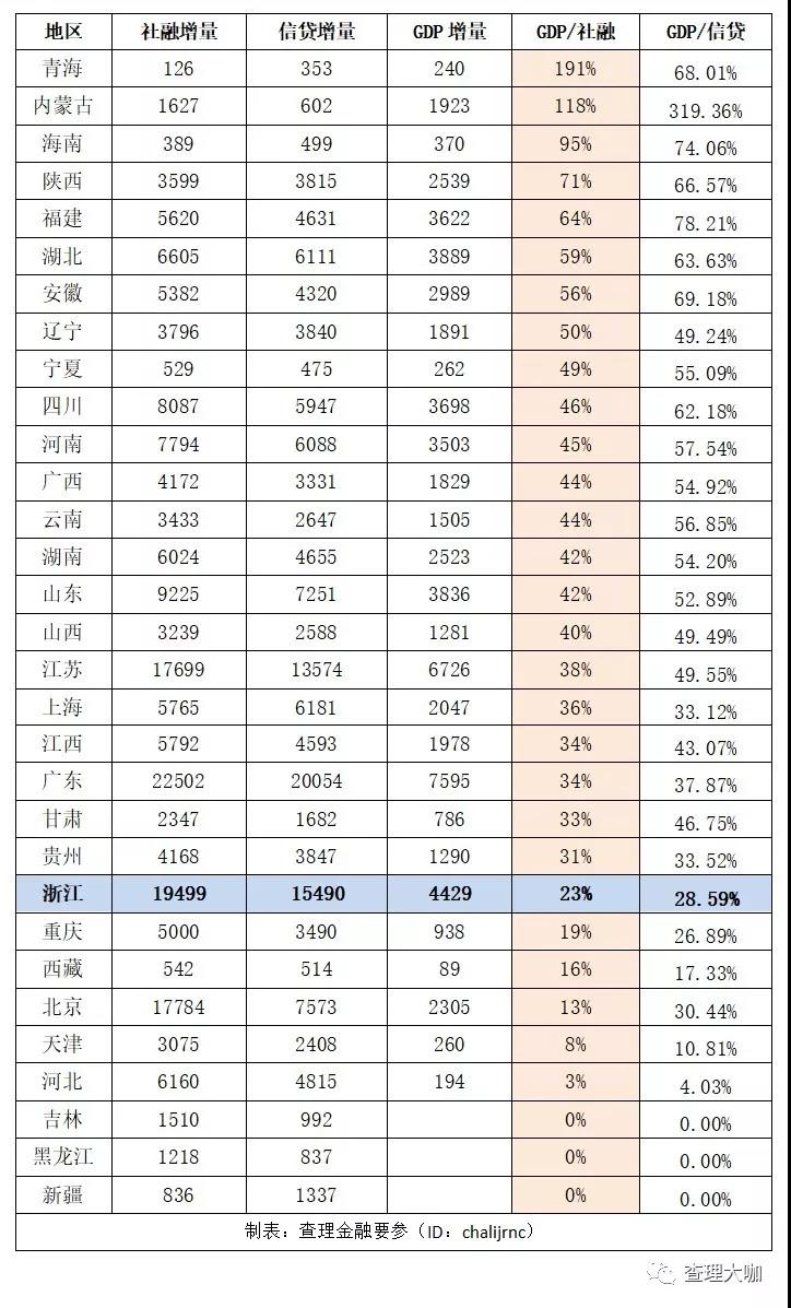 我们根据人行2013-2018年地区社会融资规模增量统计数据,将各省市融资情况进行排序,可以发现许多有意思的事情,比如浙江的融资环境确实非常好,增速远远领先其他地区,但单位社会融资带动的GDP增长却并不高,融资效应排名较后。