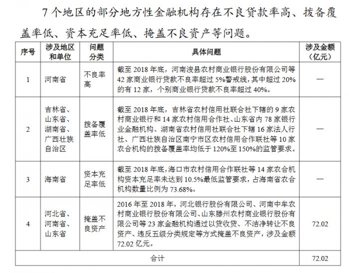 4月2日,审计署发布《2019年第1号公告:2018年第四季度国家重大政策措施落实情况跟踪审计结果》,对2018年前三季度审查出的问题进行落实,点名7个地区的部分地方性金融机构存在不良贷款率高、拨备覆盖率低、资本充足率低、掩盖不良资产等问题。