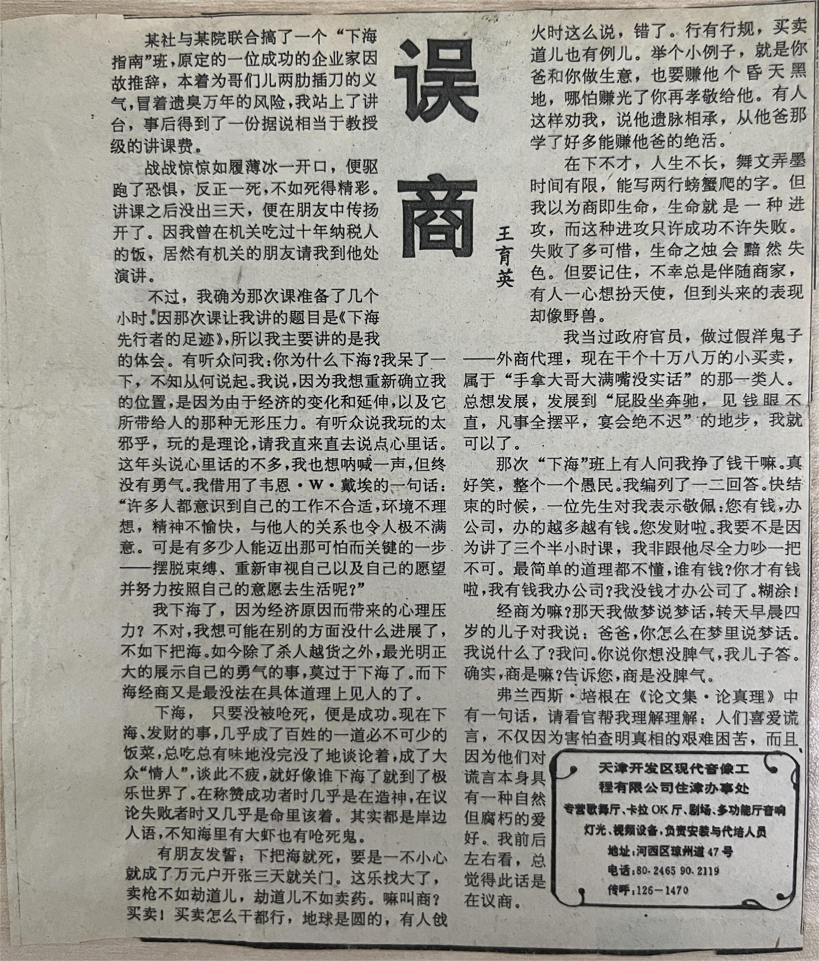 (按:“误商”是我二十五年前左右发表在“天津日报”上的一篇文章,因故确切刊登时间没记录下来。)